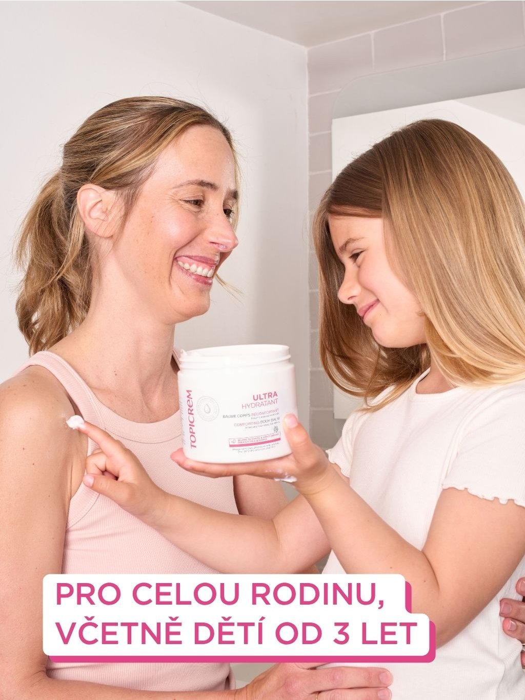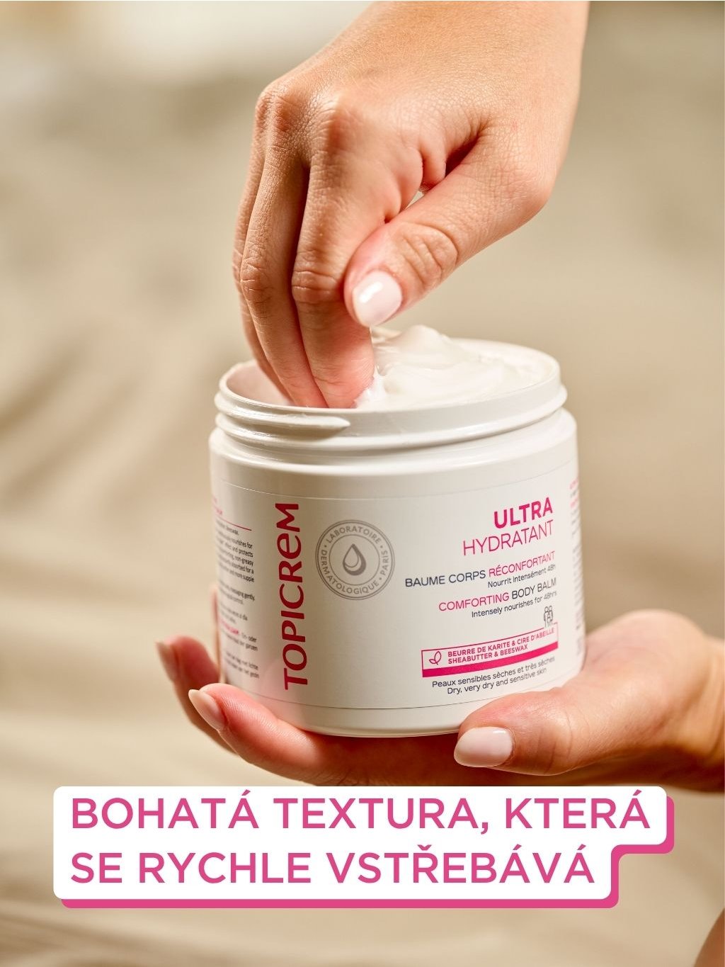 Zklidňující hydratační tělový balzám TOPICREM ULTRA s bambuckým máslem a včelím voskem intenzivně vyživuje pokožku po dobu 48 hodin*. Již po první aplikaci znatelně zmírňuje suchost pokožky** a redukuje „efekt krokodýlí kůže“. Zároveň chrání suchou až velmi suchou pokožku před vnějšími vlivy (tvrdá voda, chlad, vítr).